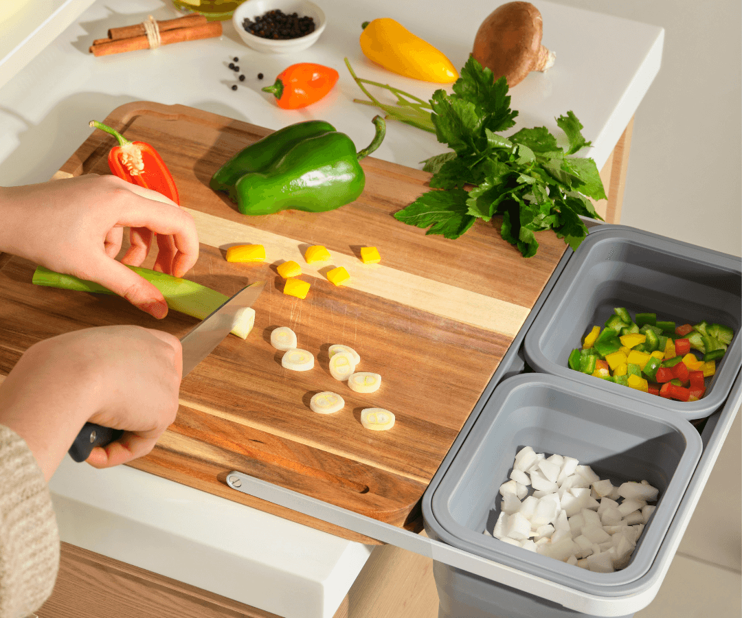 A prep station that works with you. Simply slide scraps and ingredients into containers on the fly.