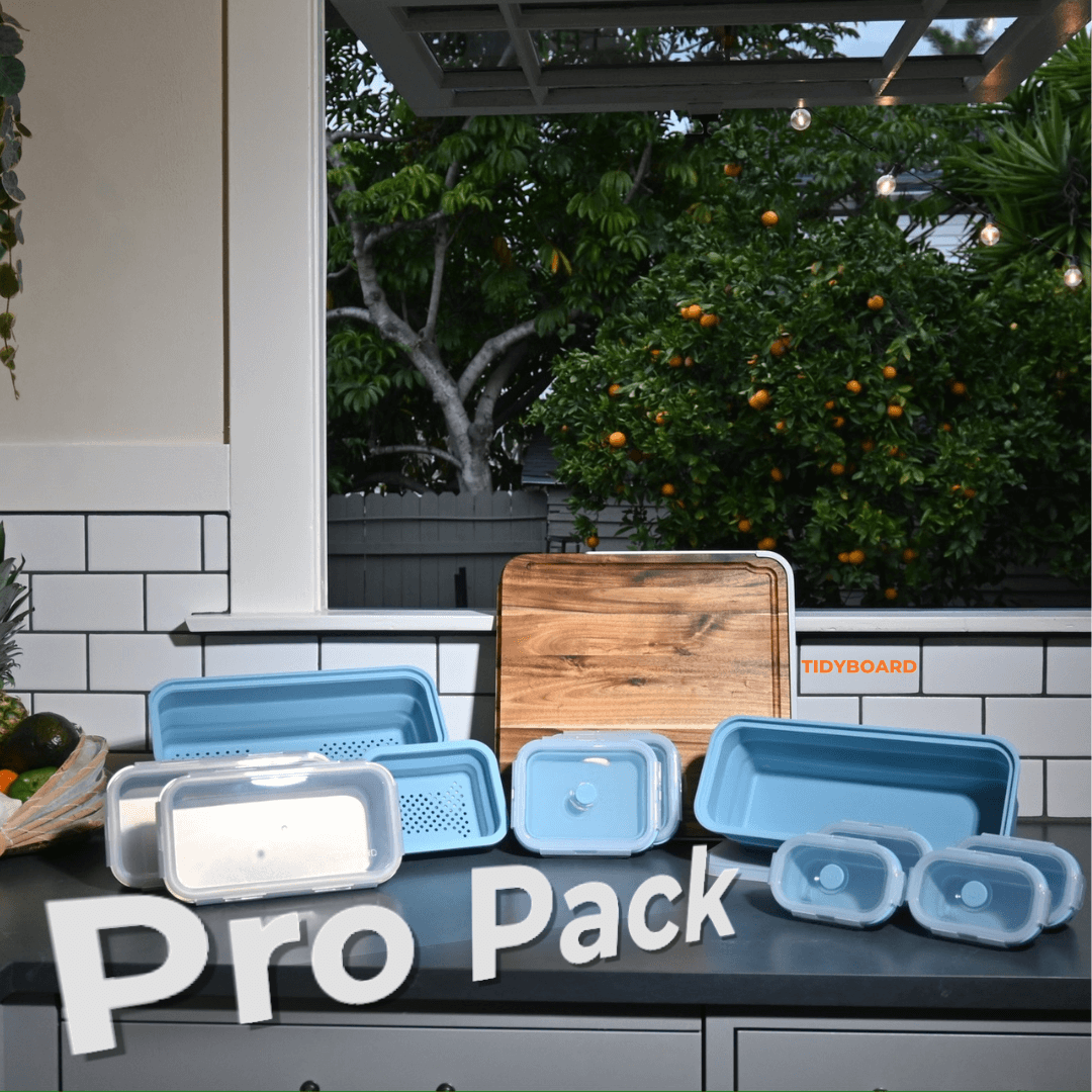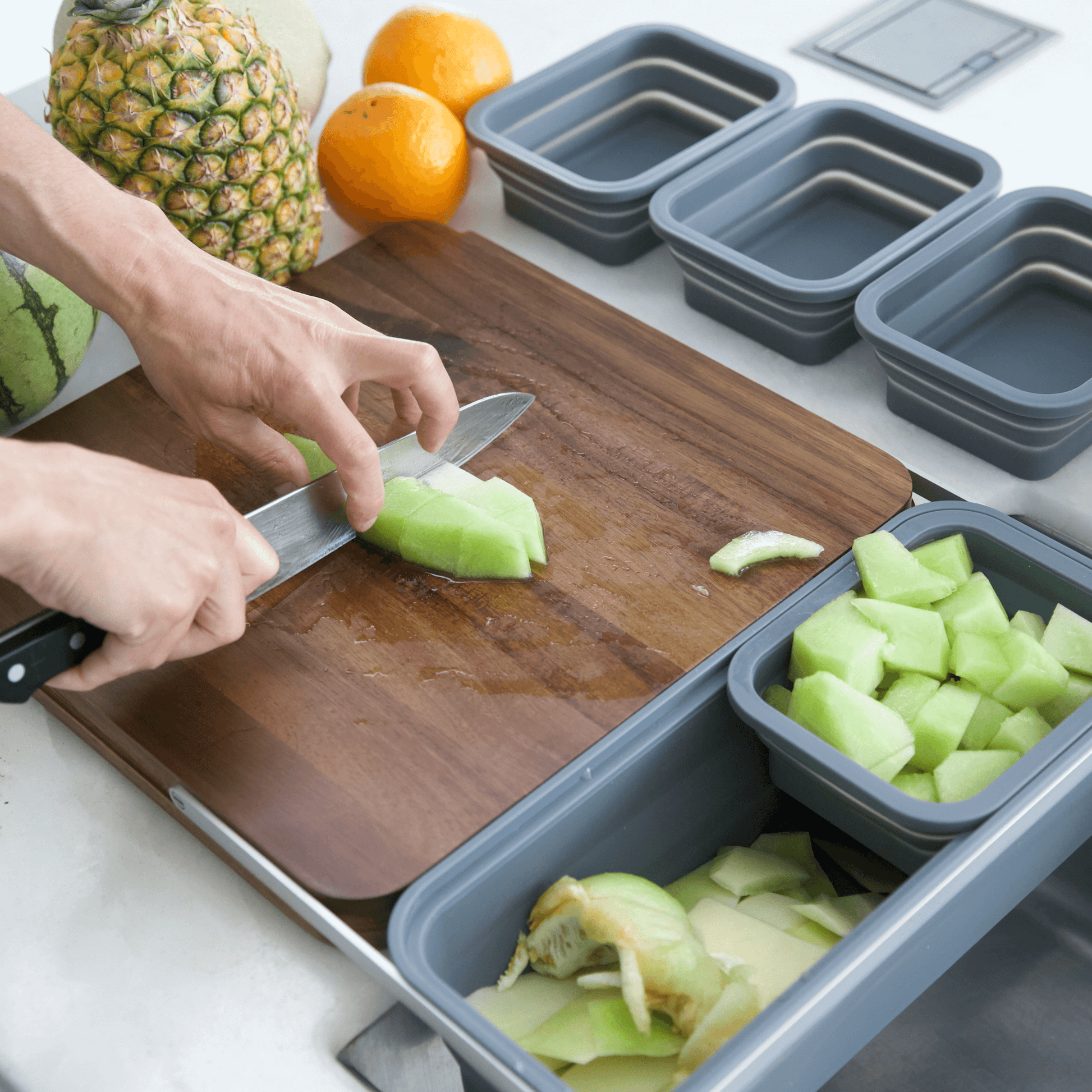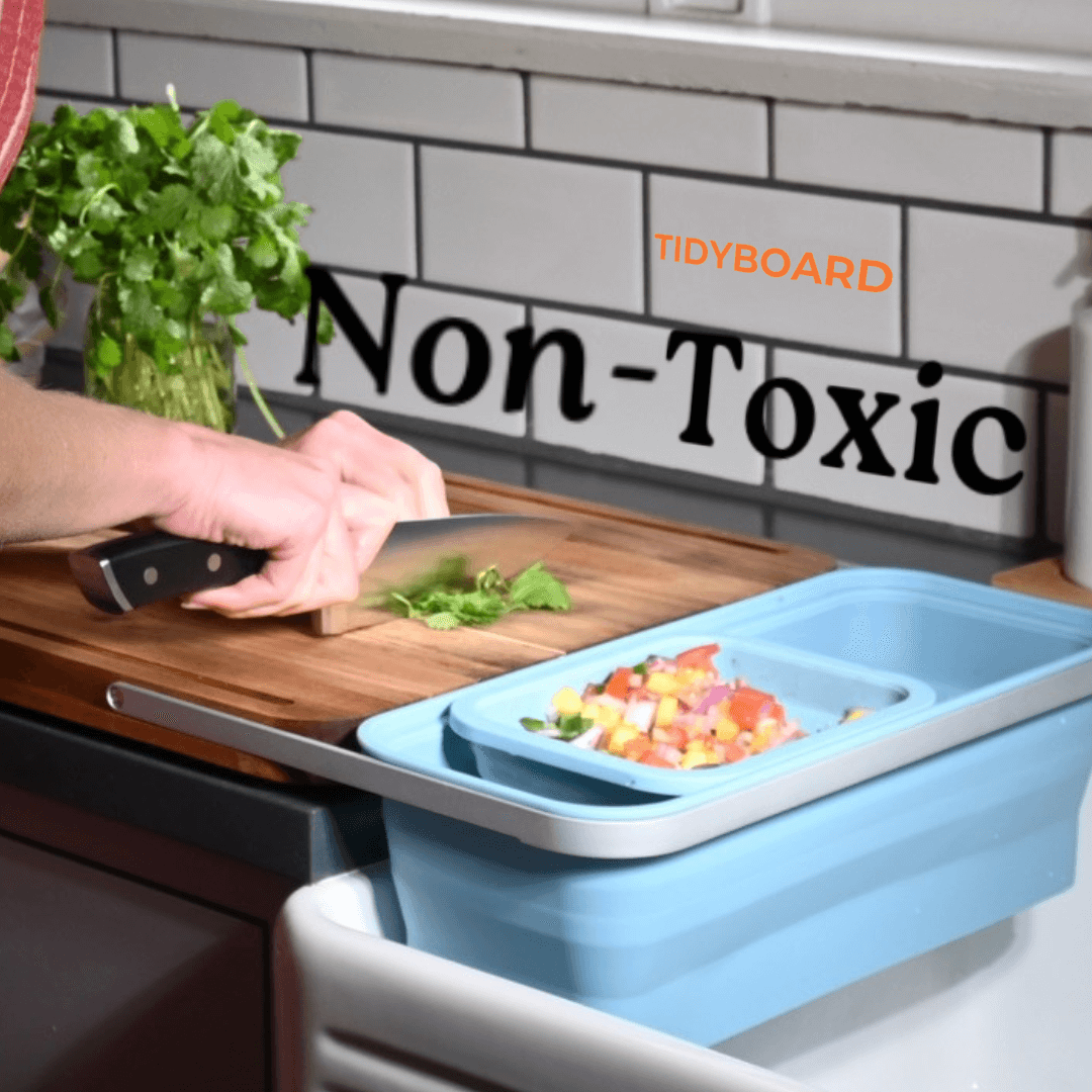 The hanging design and collapsible containers maximize countertop space and make food prep fast and fun! By hanging off the edge of the countertop or over the sink, TidyBoard utilizes previously unused space.