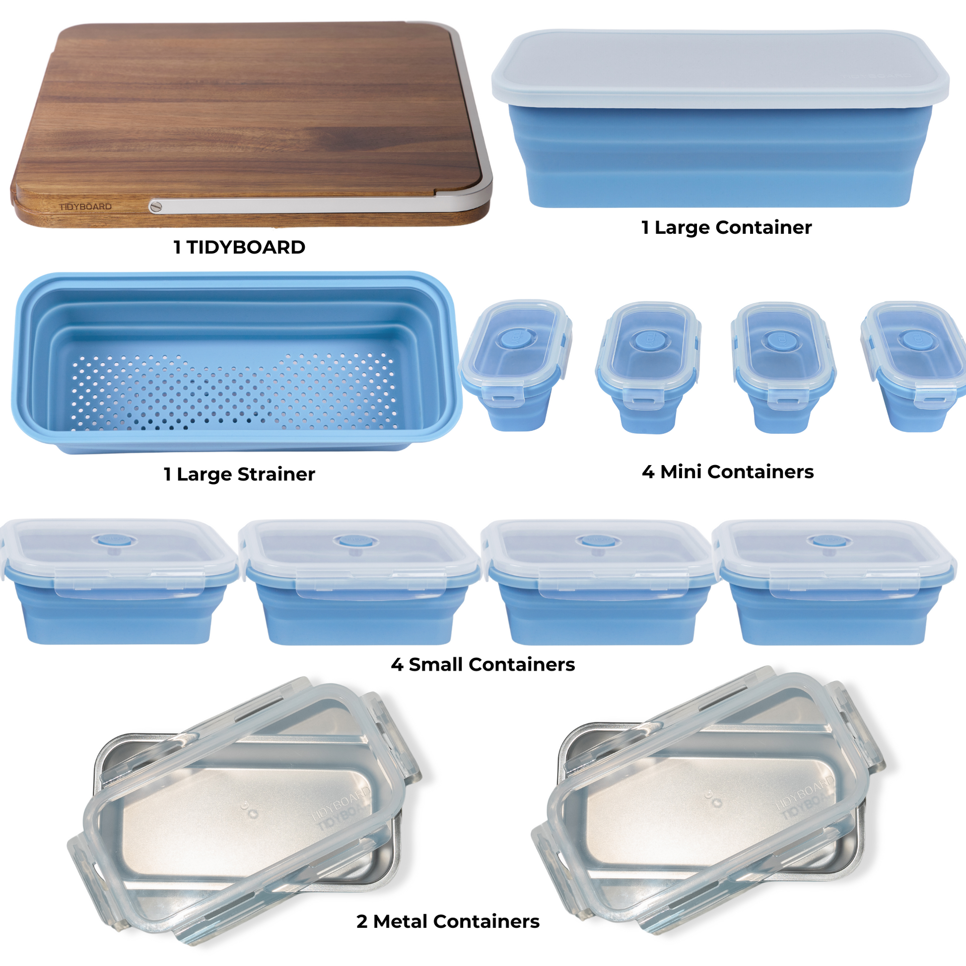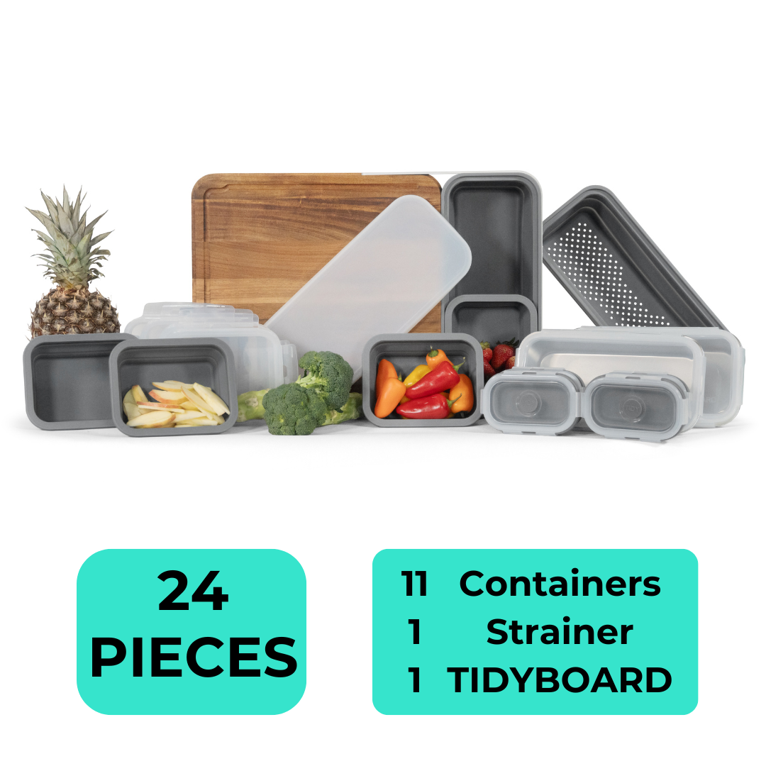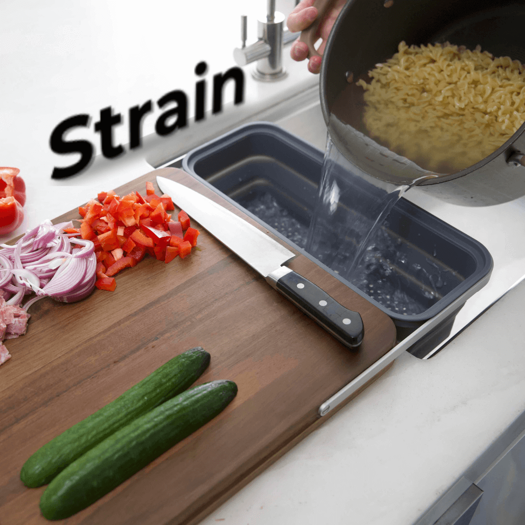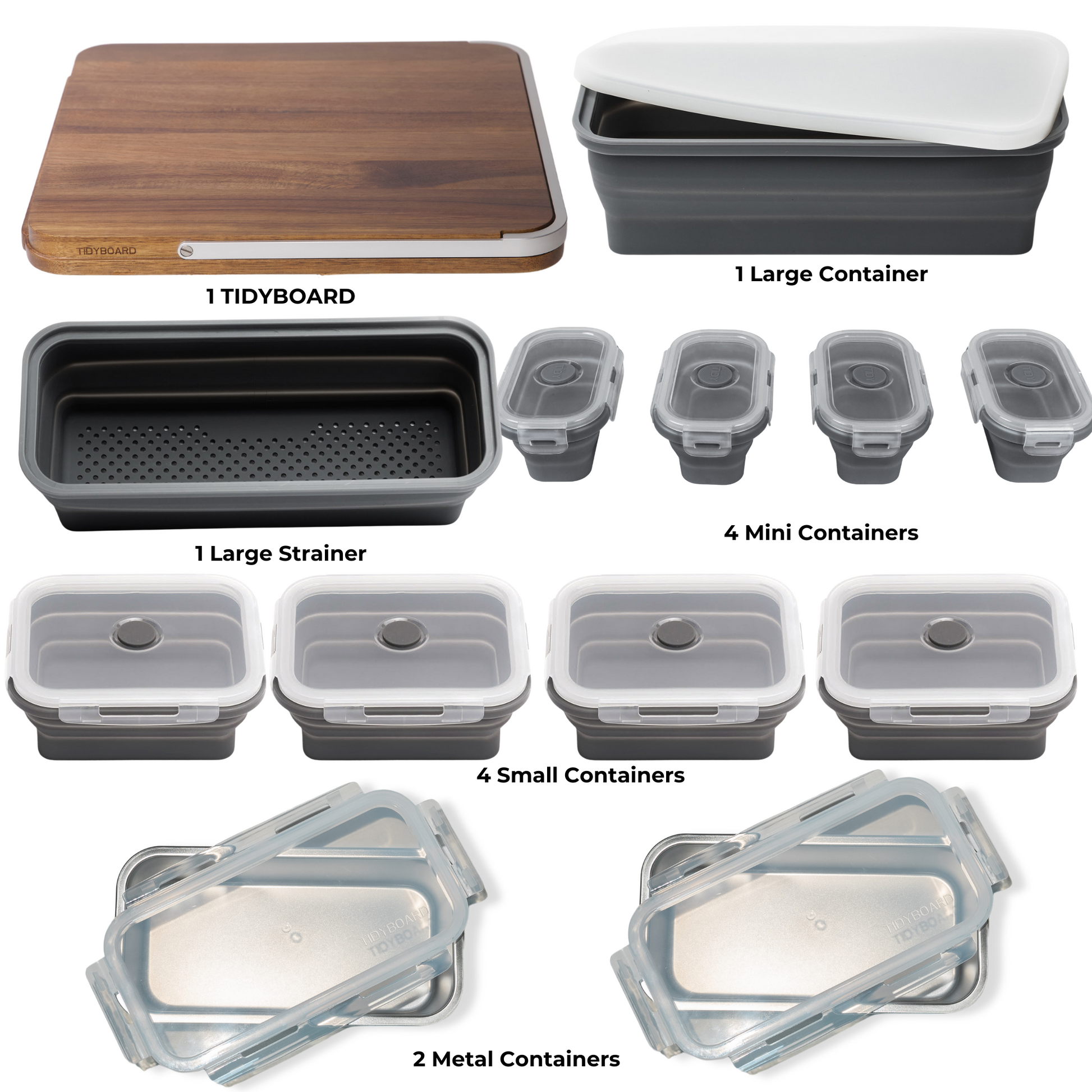 The hanging design and collapsible containers maximize countertop space and make food prep fast and fun! By hanging off the edge of the countertop or over the sink, TidyBoard utilizes previously unused space.