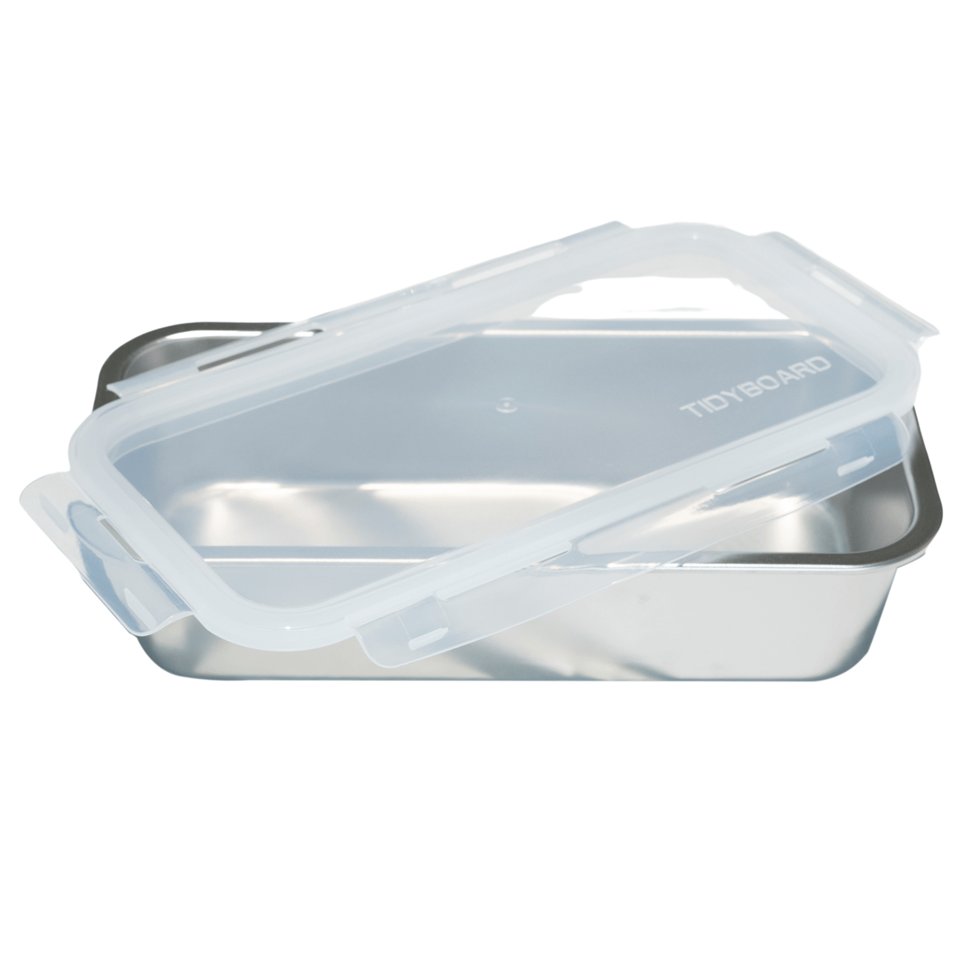 The TidyBoard was mindfully influenced by math and physics. Our board is engineered as a lever to stay steady even with a heavy load in the containers. It can hold up to 9 lbs of food in its container while hanging off your counter.