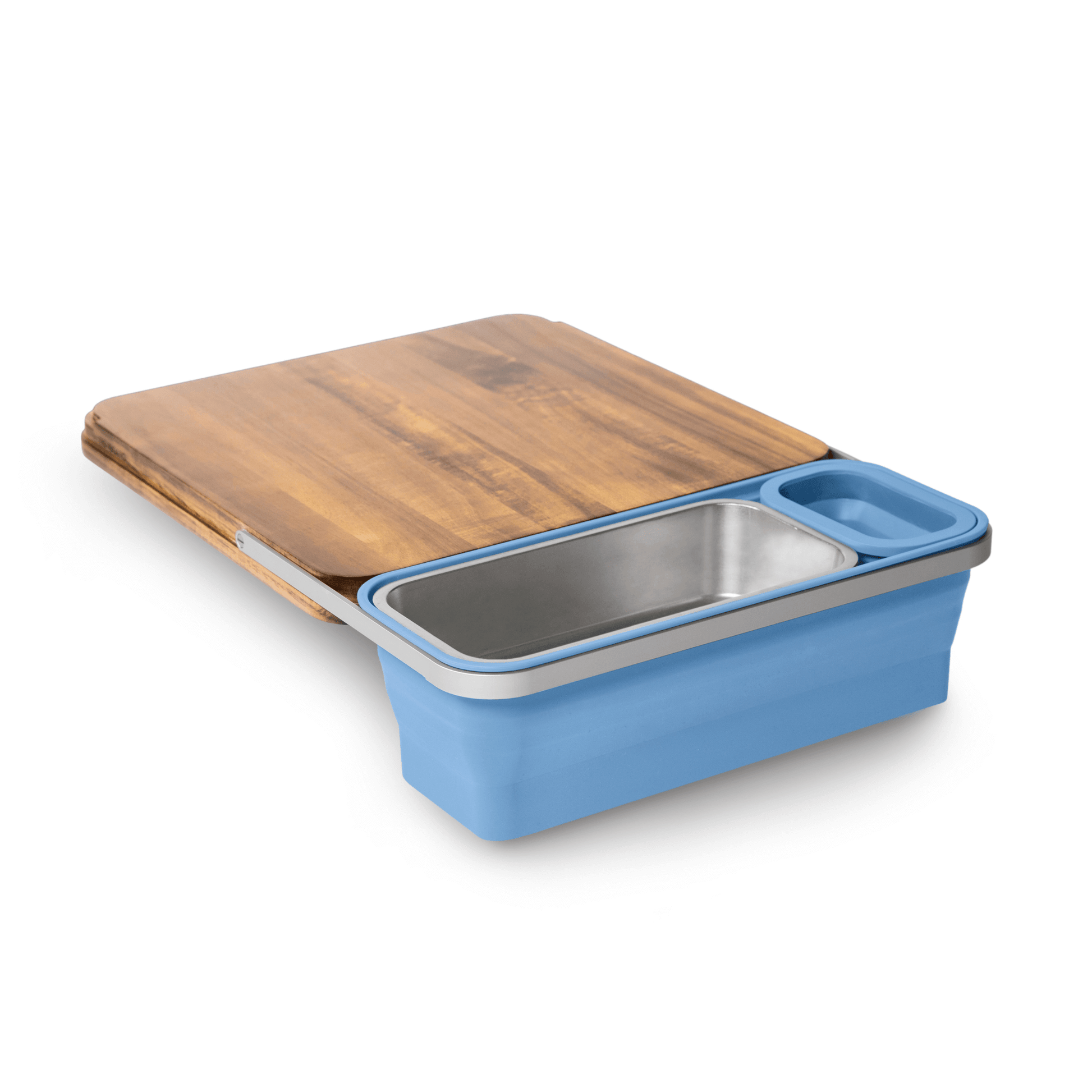 The hanging design and collapsible containers maximize countertop space and make food prep fast and fun! By hanging off the edge of the countertop or over the sink, TidyBoard utilizes previously unused space.