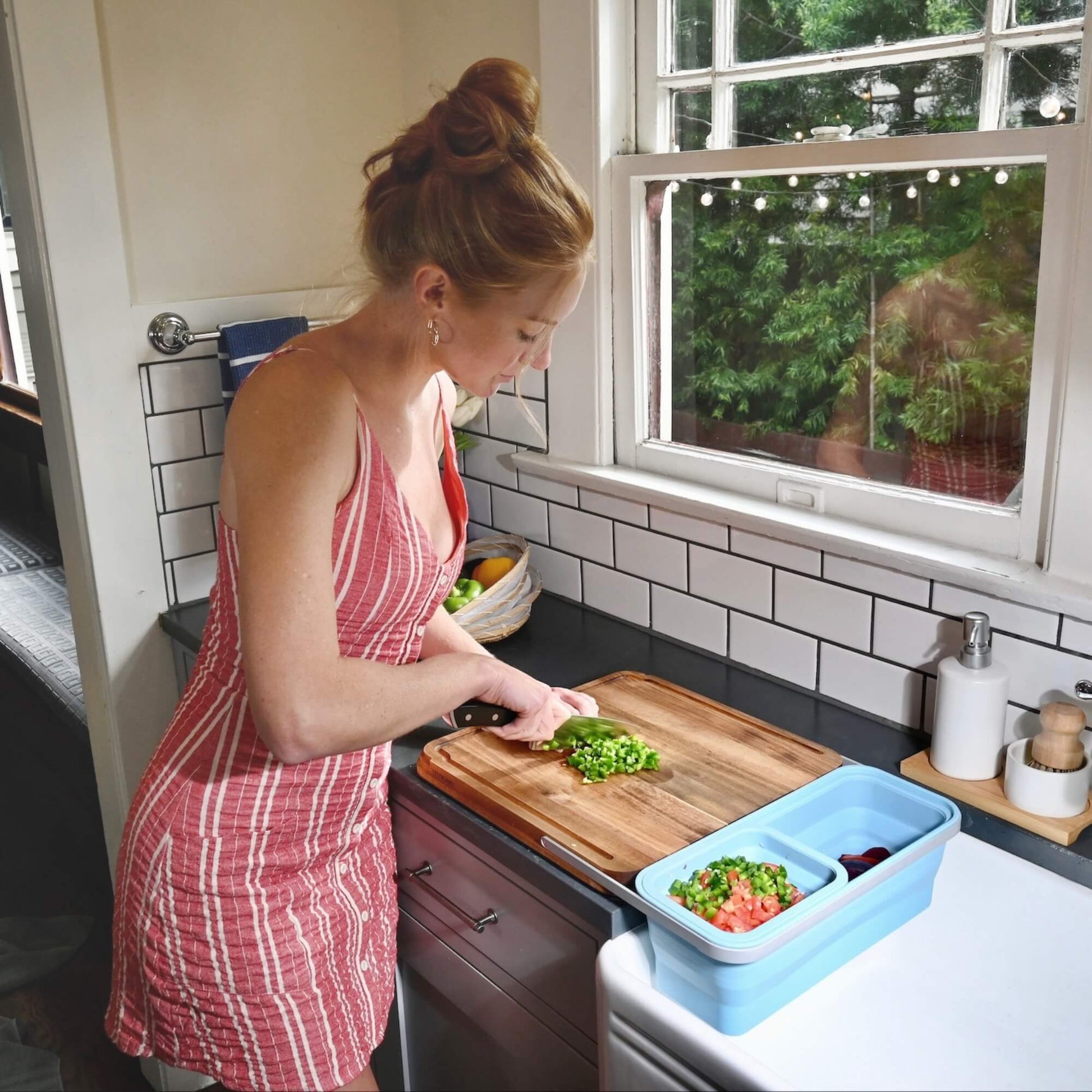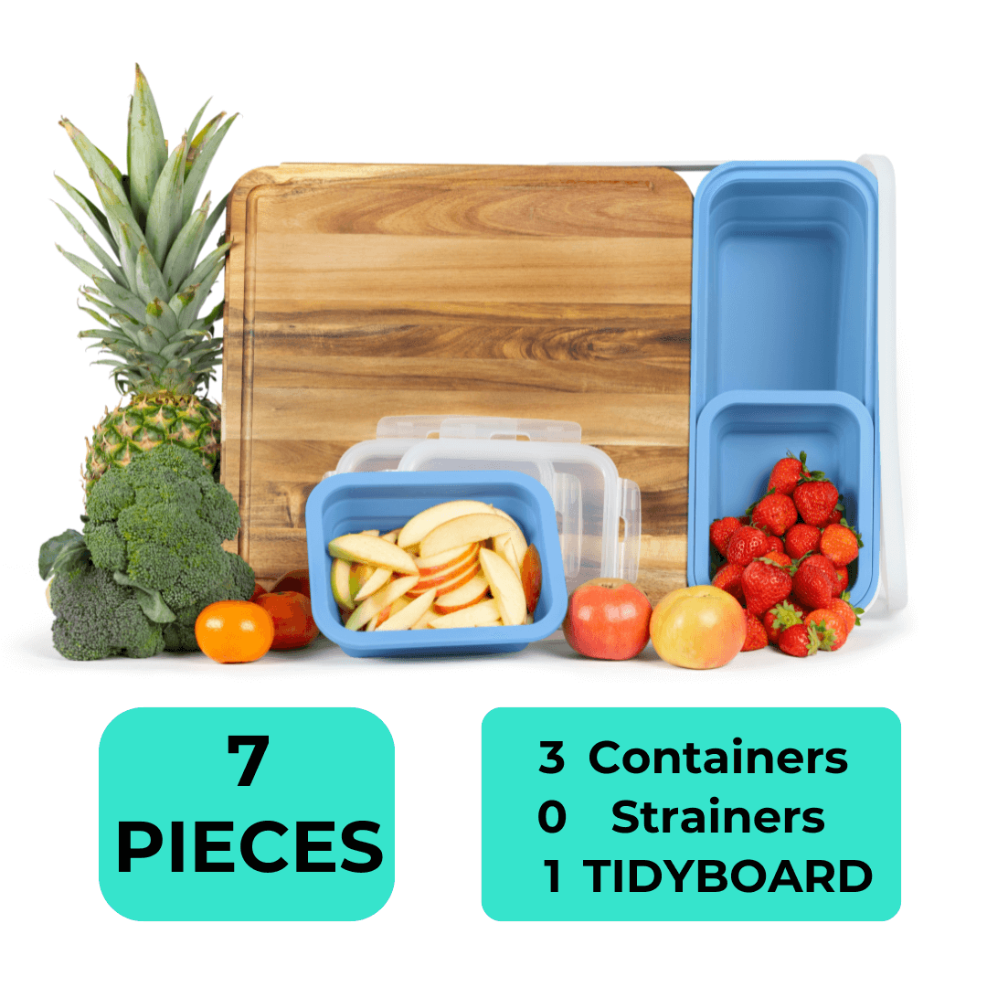 The hanging design and collapsible containers maximize countertop space and make food prep fast and fun! By hanging off the edge of the countertop or over the sink, TidyBoard utilizes previously unused space.